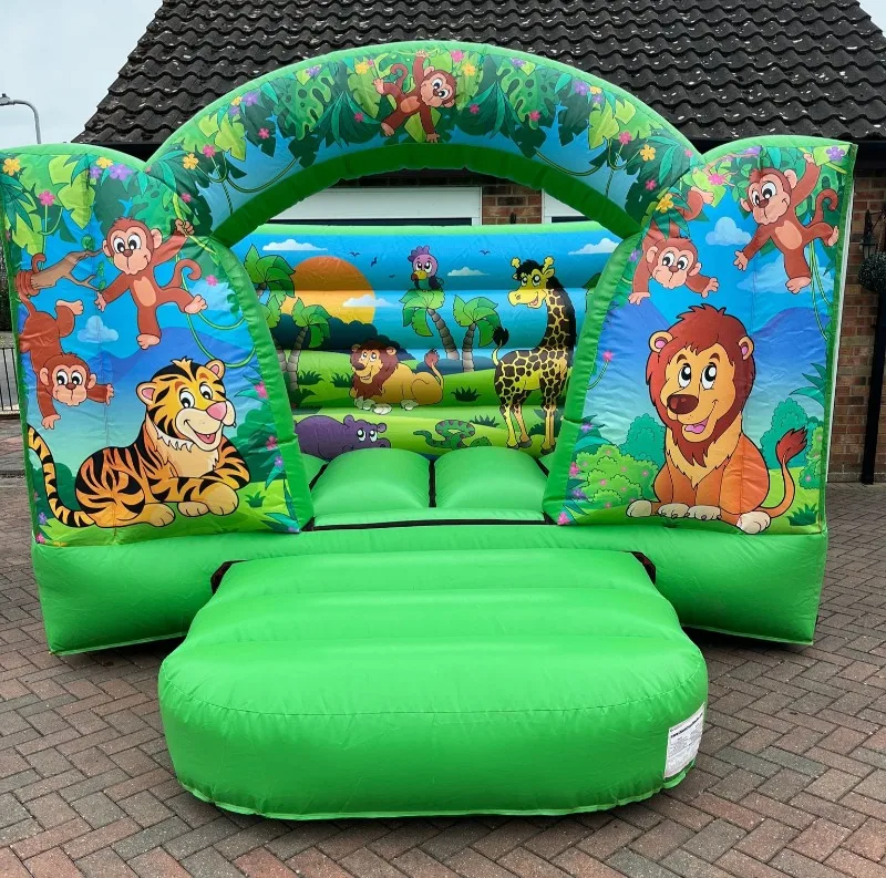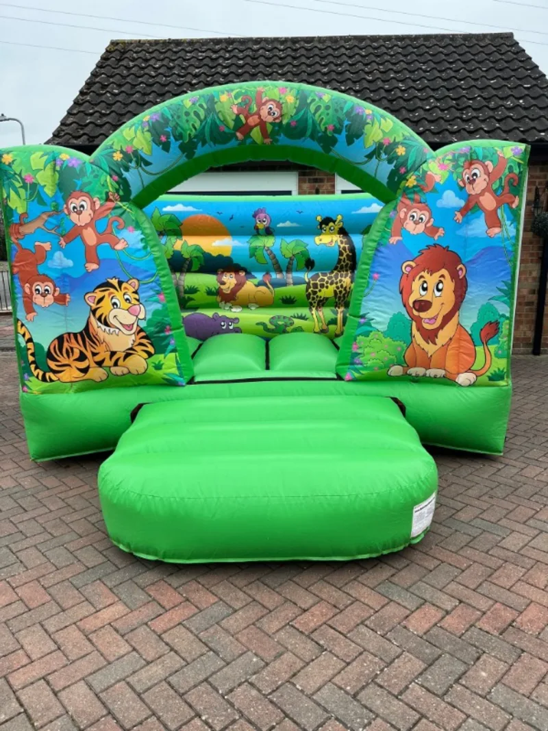 A 10ft by 12ft Junior Jungle low height bouncy castle. This castle benefits from a really low height of 7.5ft... meaning this castle is perfect for indoors with a limited ceiling height. This castle also has a lip on the front of the unit that prevents younger/smaller children from falling out of the bouncy castle.